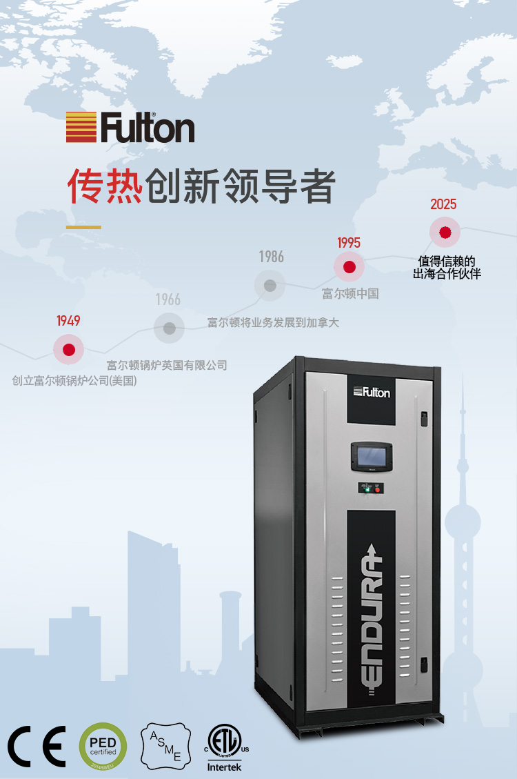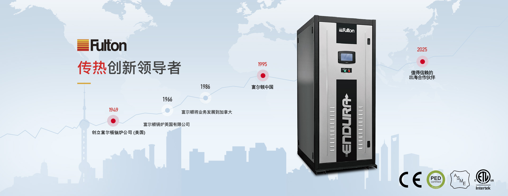 富爾頓是國(guó)際著名的跨國(guó)高質(zhì)量傳熱產(chǎn)品制造商,具有七十多年的專業(yè)設(shè)計(jì)、制造、銷售鍋爐的經(jīng)驗(yàn),是立式無(wú)管鍋爐和脈沖燃燒鍋爐的發(fā)明者,幾十年來(lái)一直領(lǐng)導(dǎo)世界鍋爐新潮流。